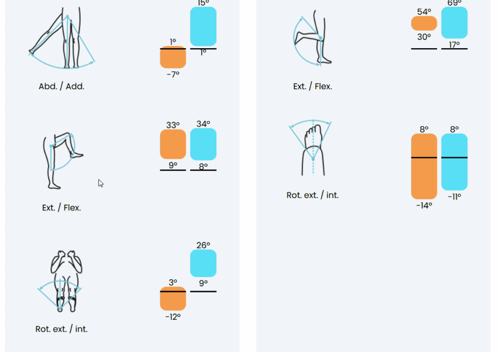 Toute analyse inclut une analyse avec vidéo-goniométrie. Nous possédons un système de capteurs brevetés capables de quantifier le mouvement articulaire en