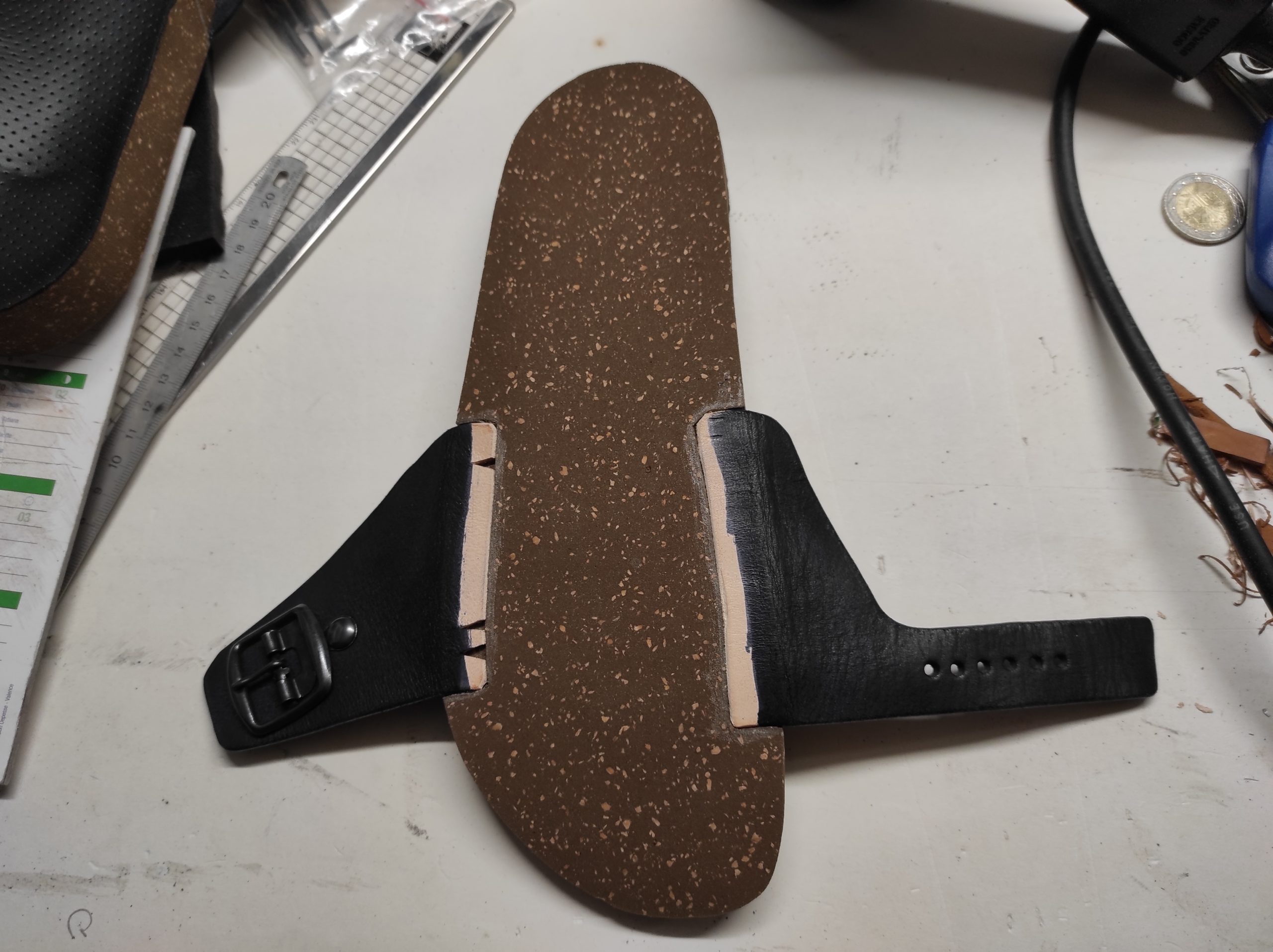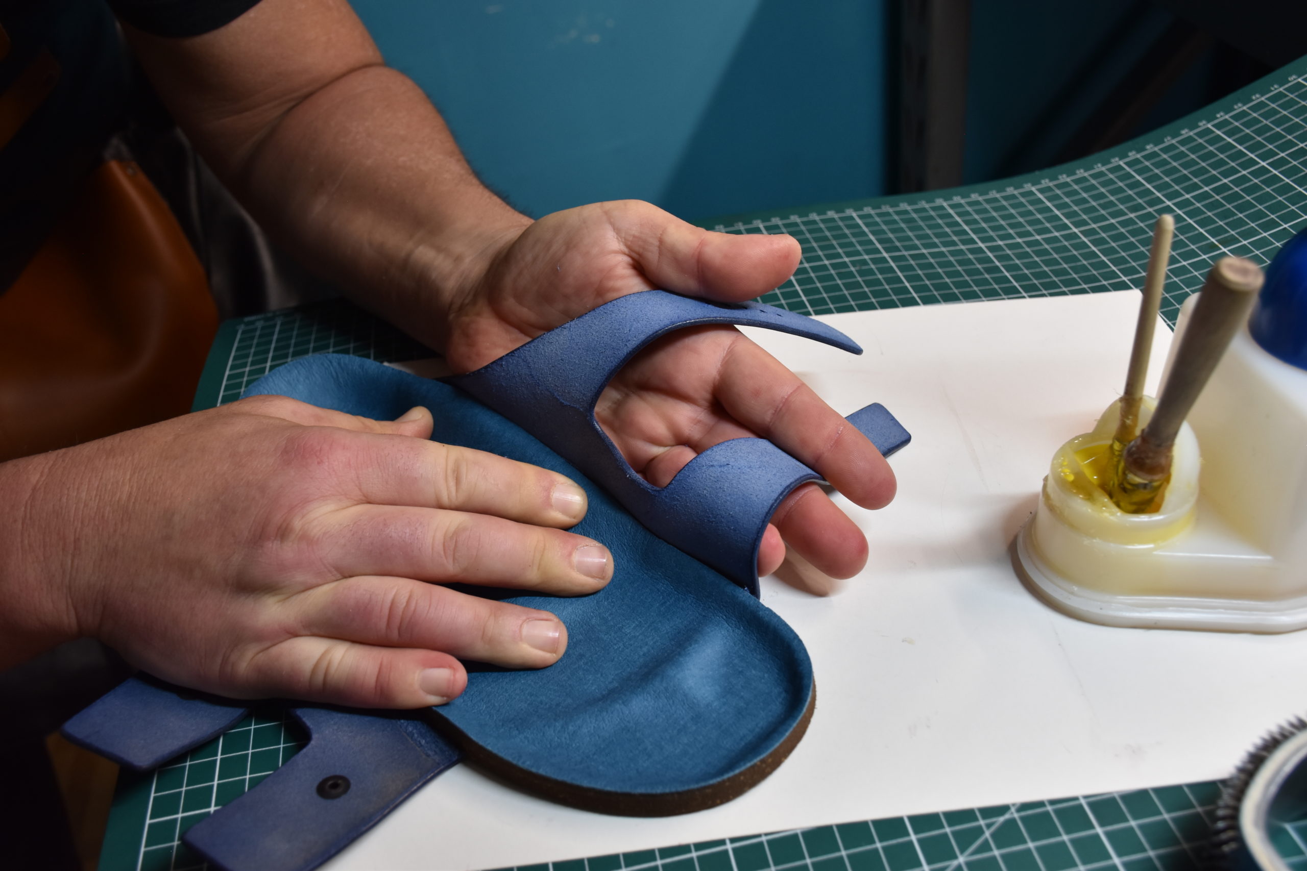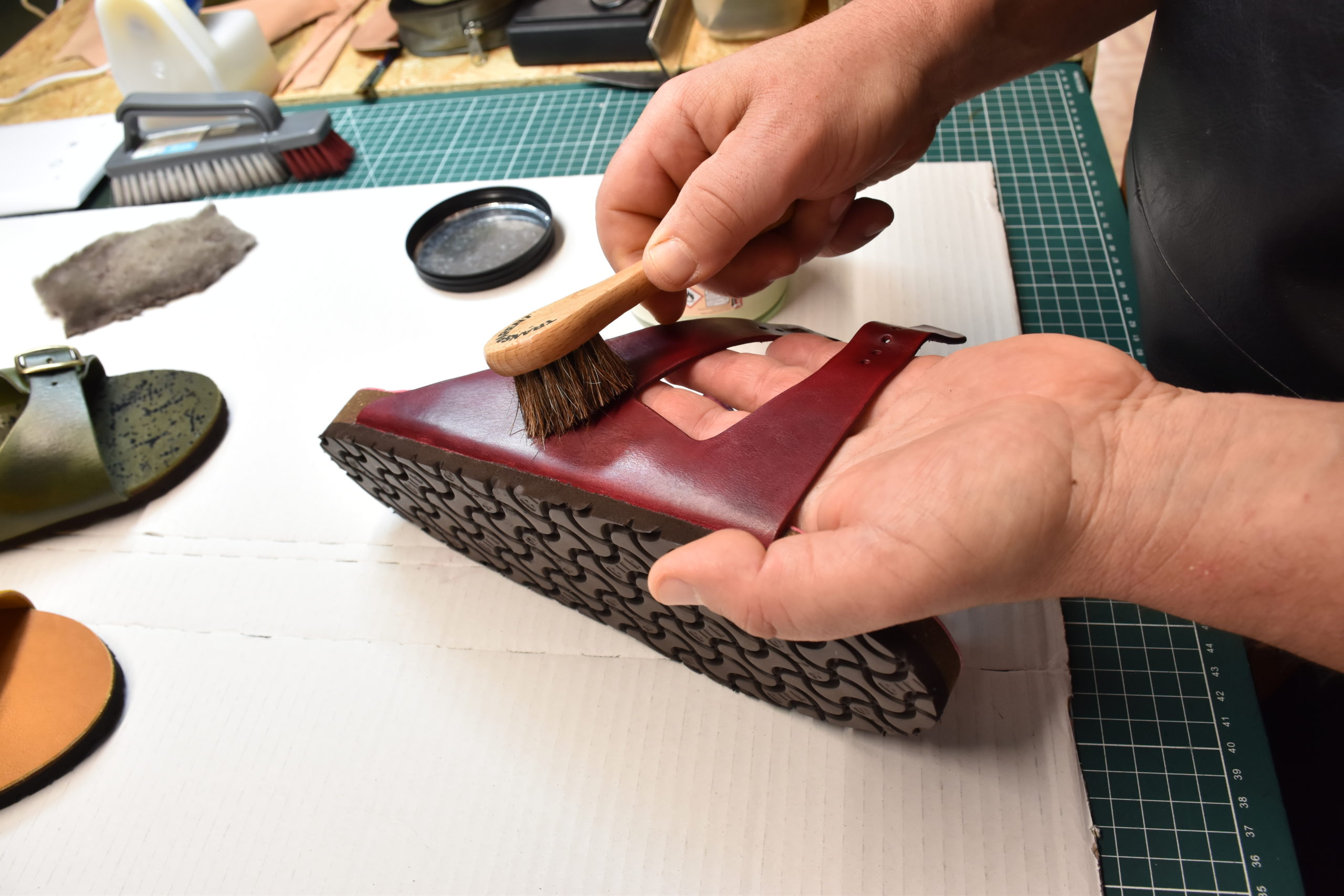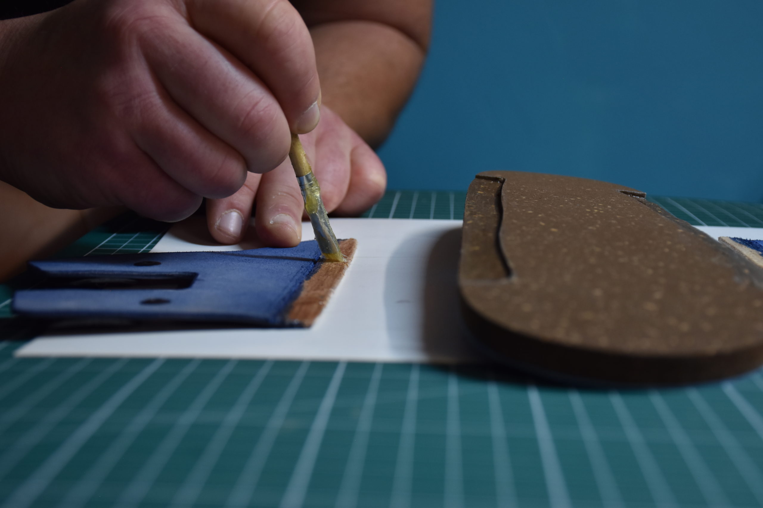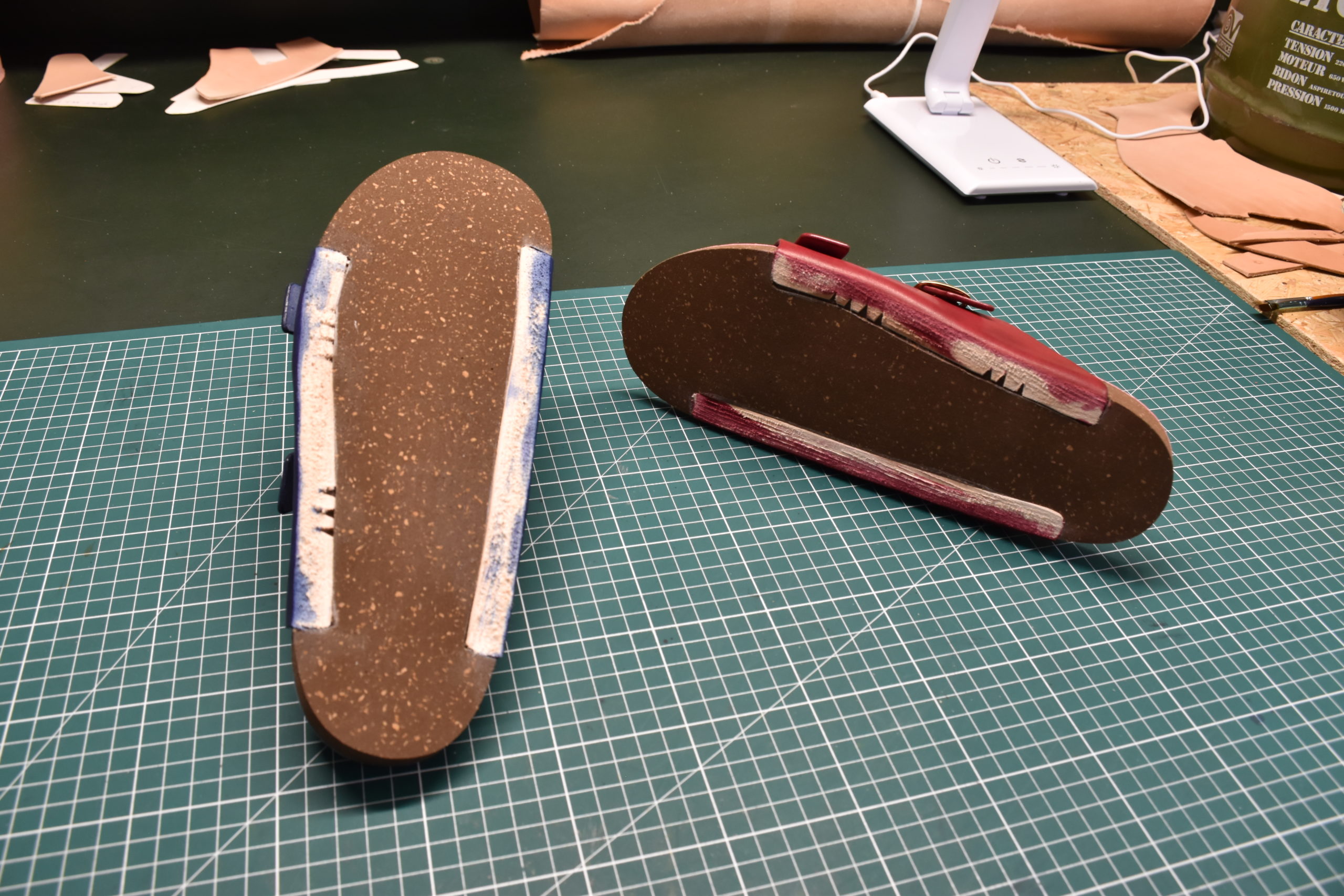 Les pièces de cuir sont cardées (griffage de la partie intérieure du cuir qui sera collée en dessous et sur les côtés de la sandale). Ceci offre un meilleur maintient de la colle car les fibres du cuir se fixeront plus efficacement à la colle. Les pièces sont ensuite encollées oui pressées pour retirer l’air emprisonné et obtenir un collage très résistant.
