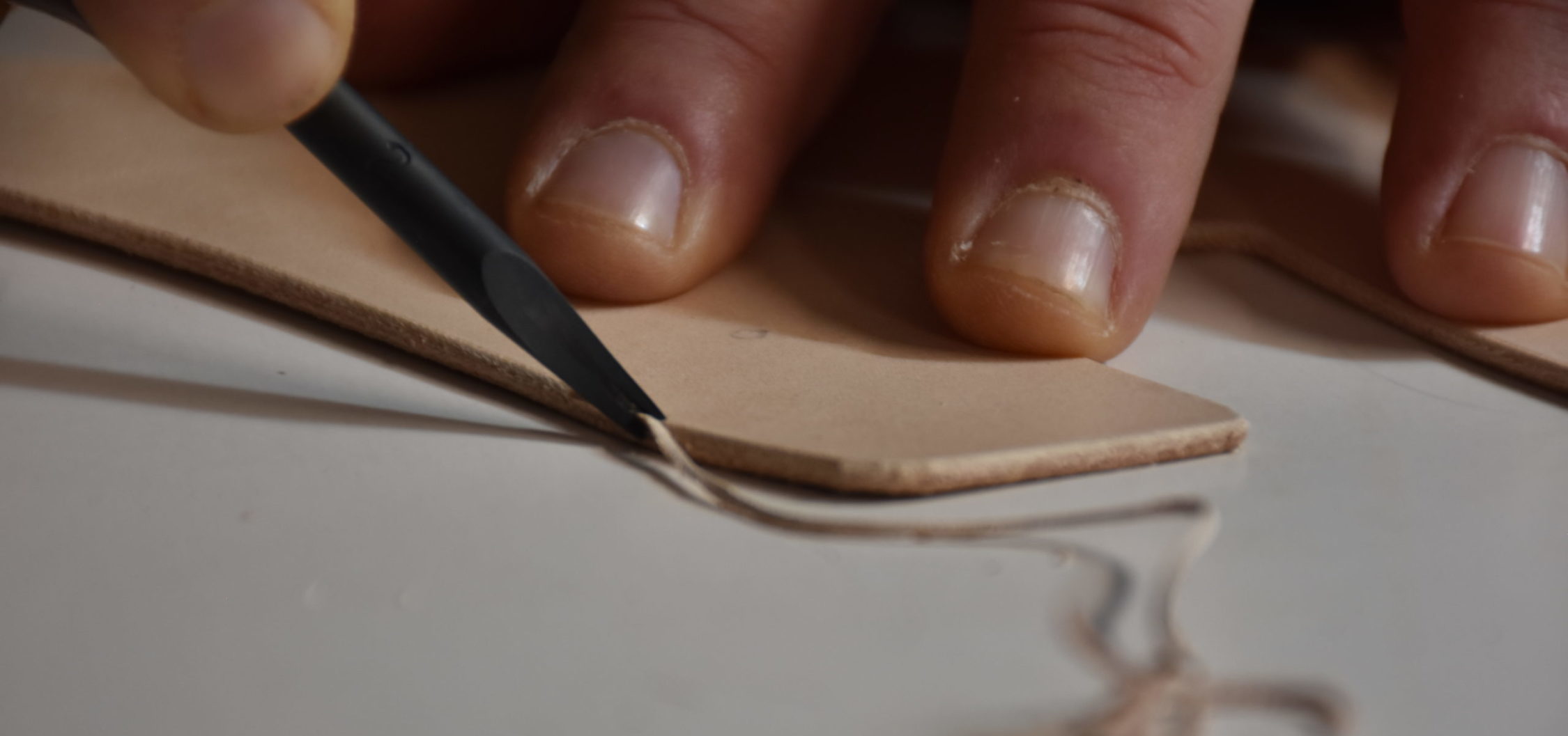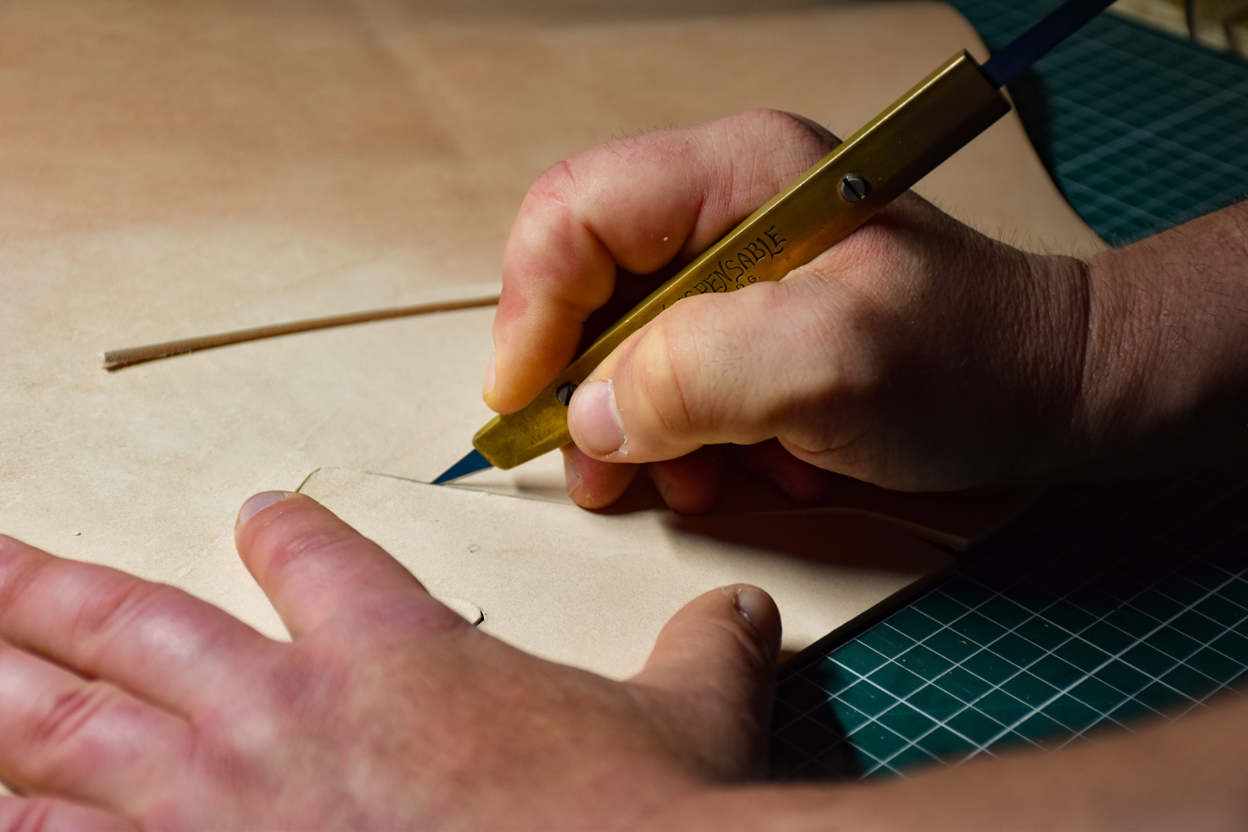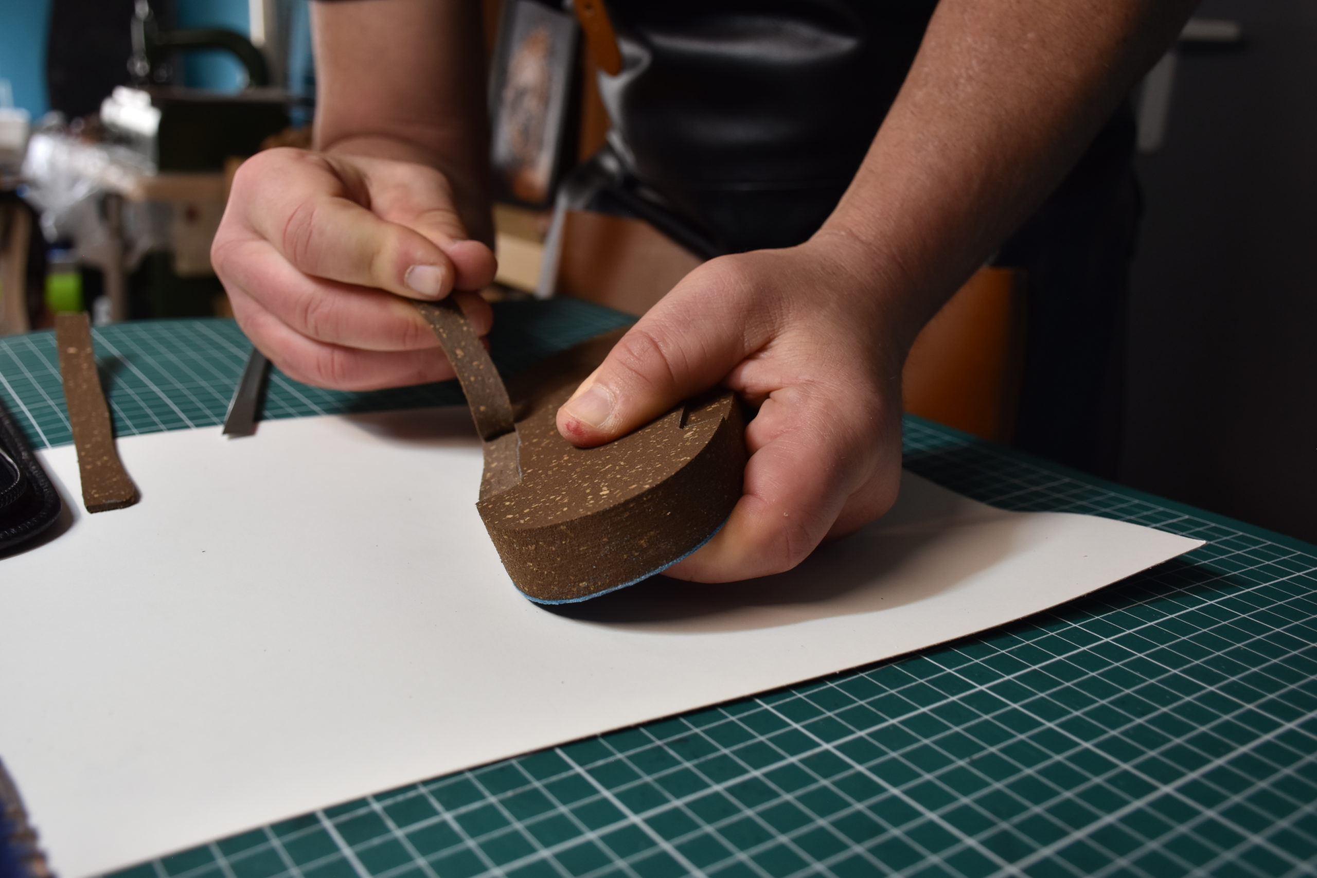 Puis il découpe les différentes pièces et procède au brunissage des angles (polissage des angles du cuir qui sont saillants après la découpe pour une finition parfaite et soignée).