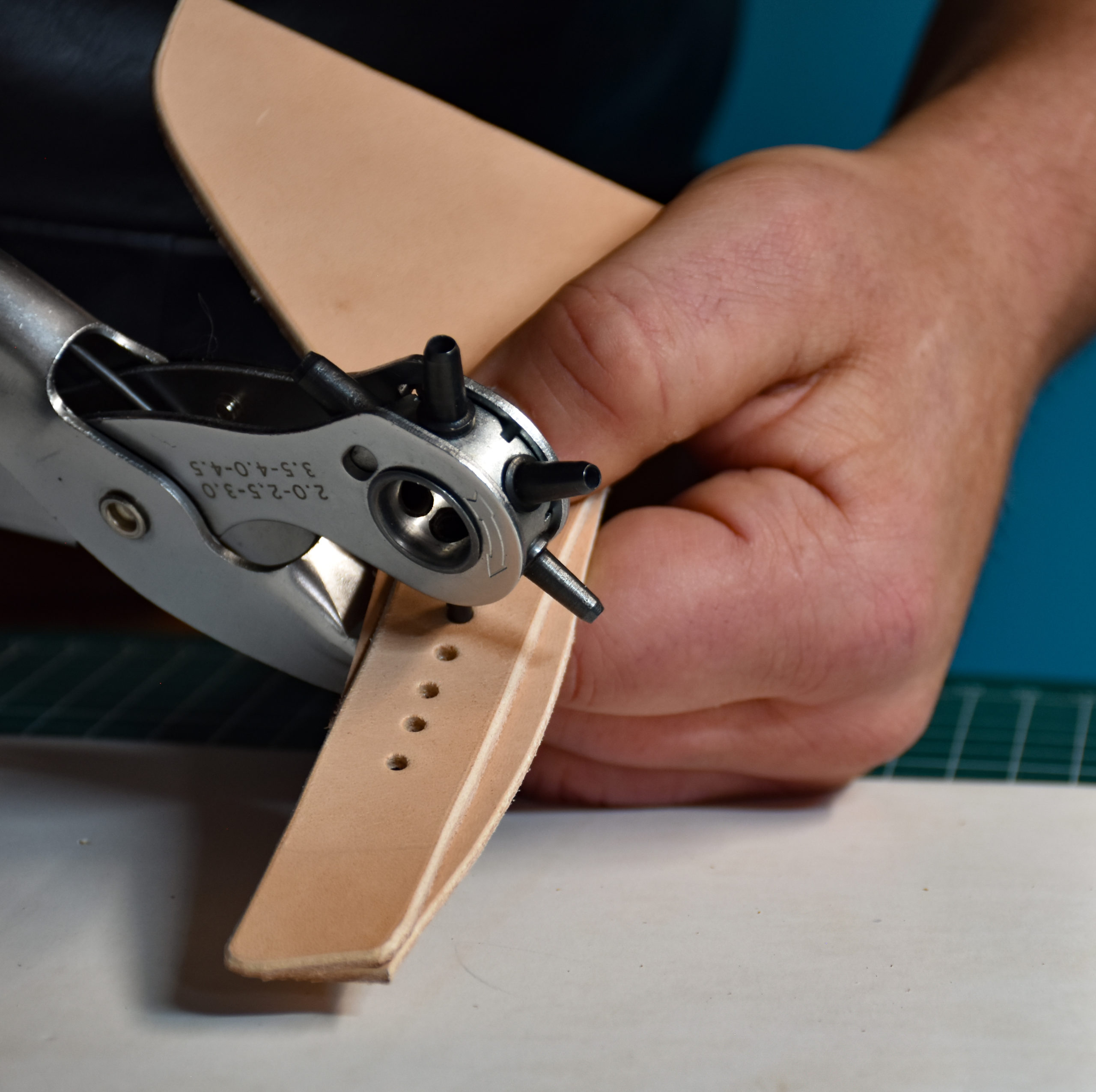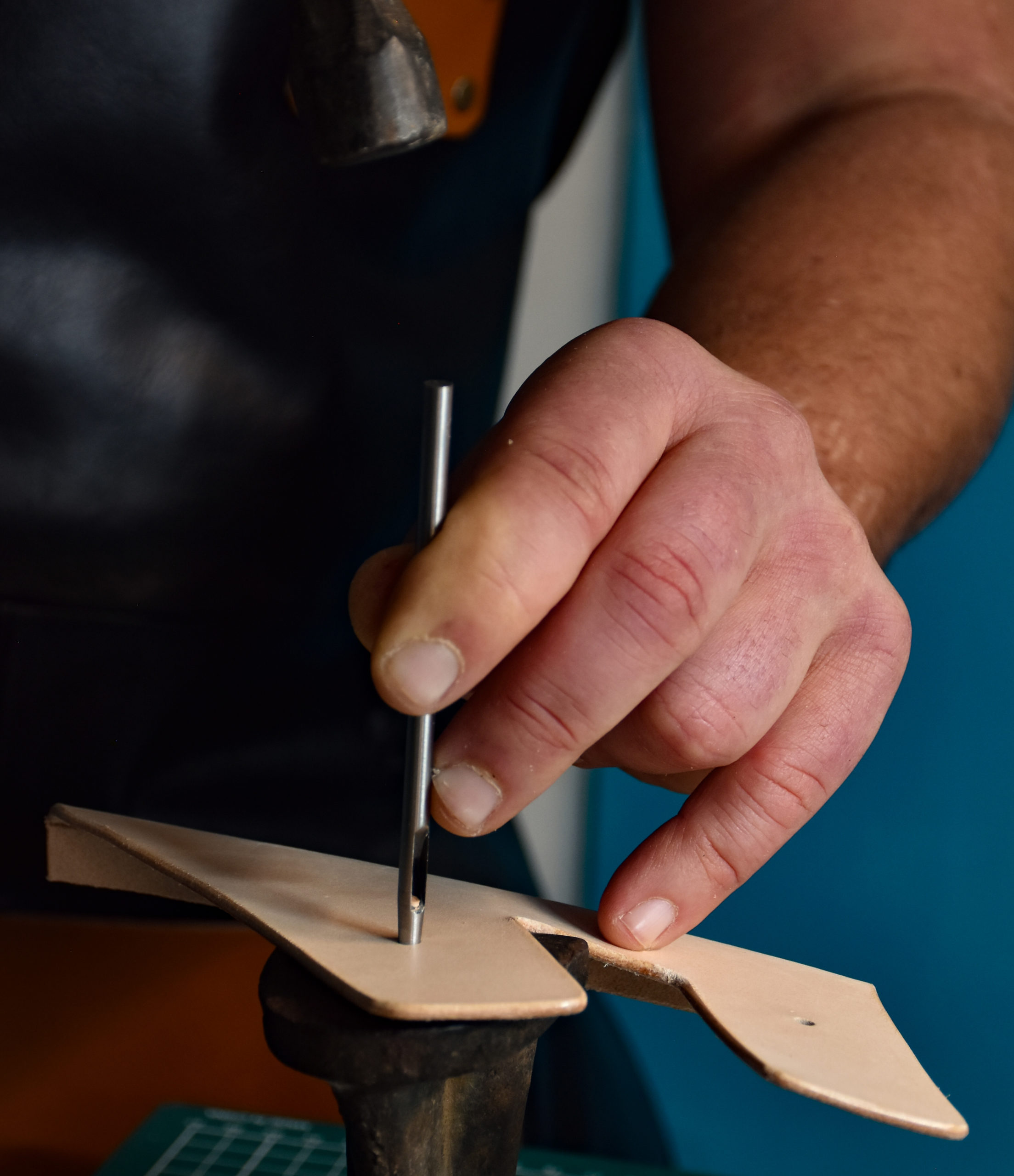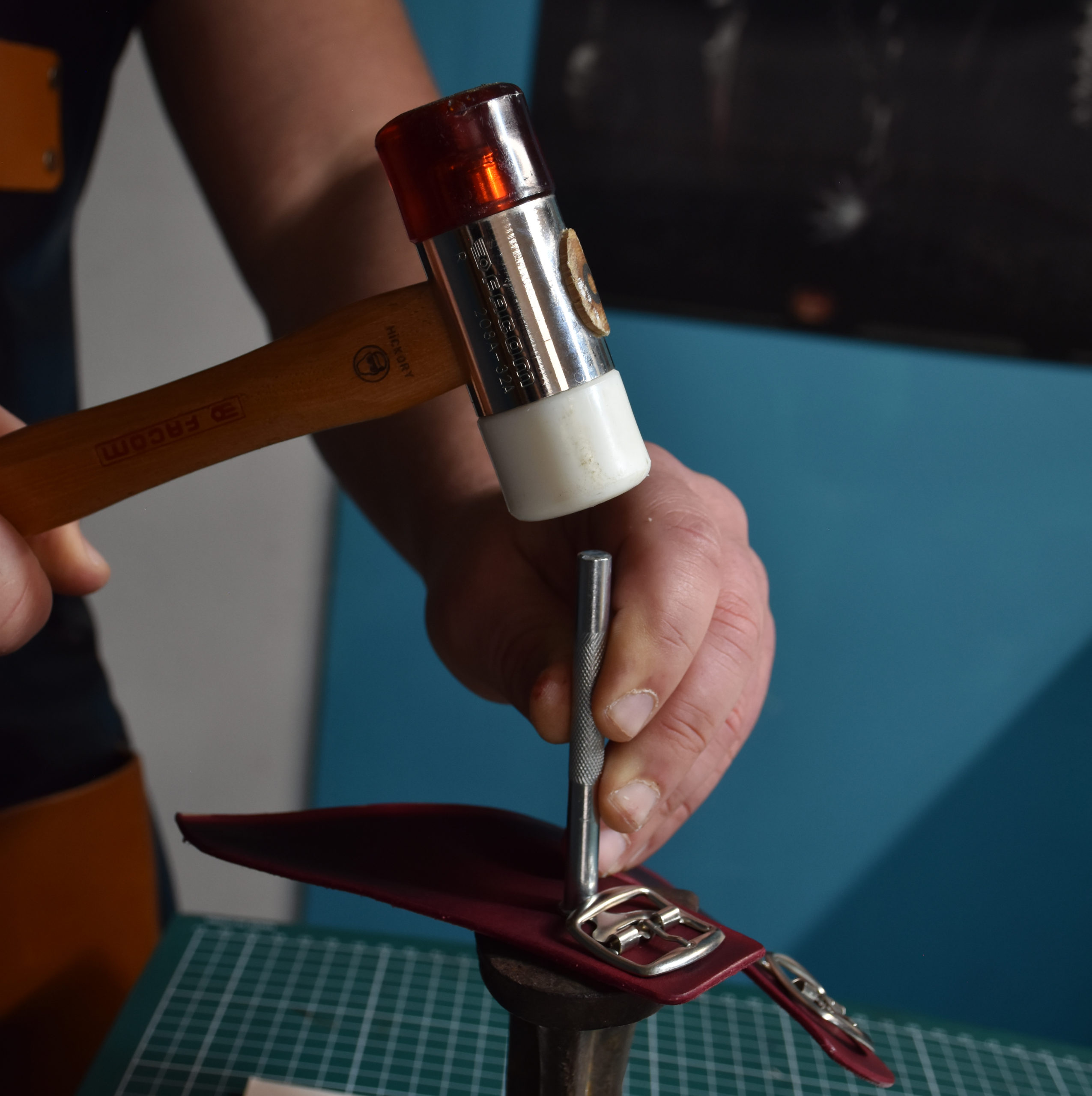 Puis il découpe les différentes pièces et procède au brunissage des angles (polissage des angles du cuir qui sont saillants après la découpe pour une finition parfaite et soignée).