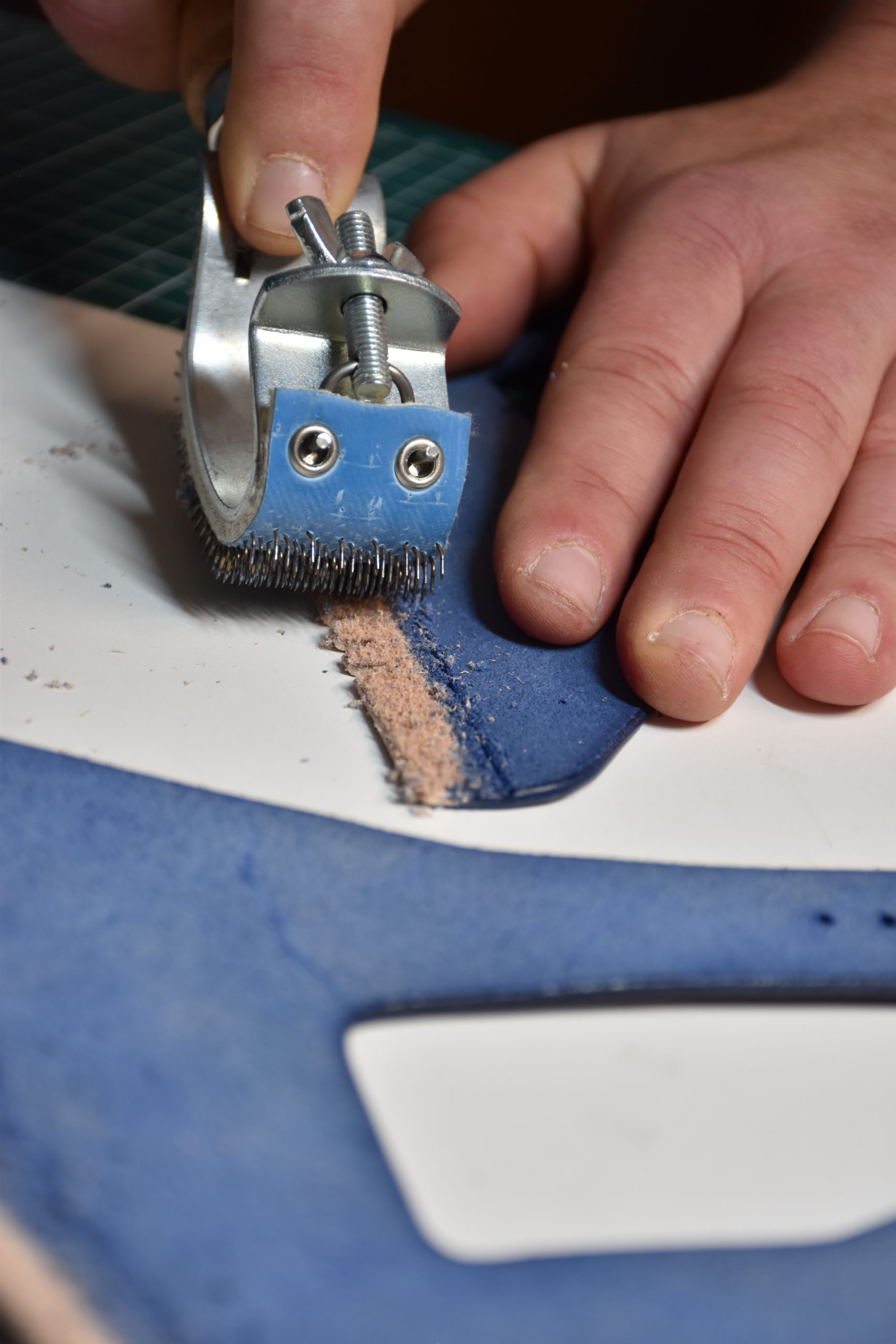 Le cordonnier procède au lamage de la semelle. Il réalise pour cela des incisions sur le bord de la semelle et retire une partie de la matière. Cette action permettra d’insérer le cuir à l’intérieur de la semelle, ce qui évitera d’avoir une surépaisseur sous la semelle, ce qui entrainerait une gêne pour le patient.
