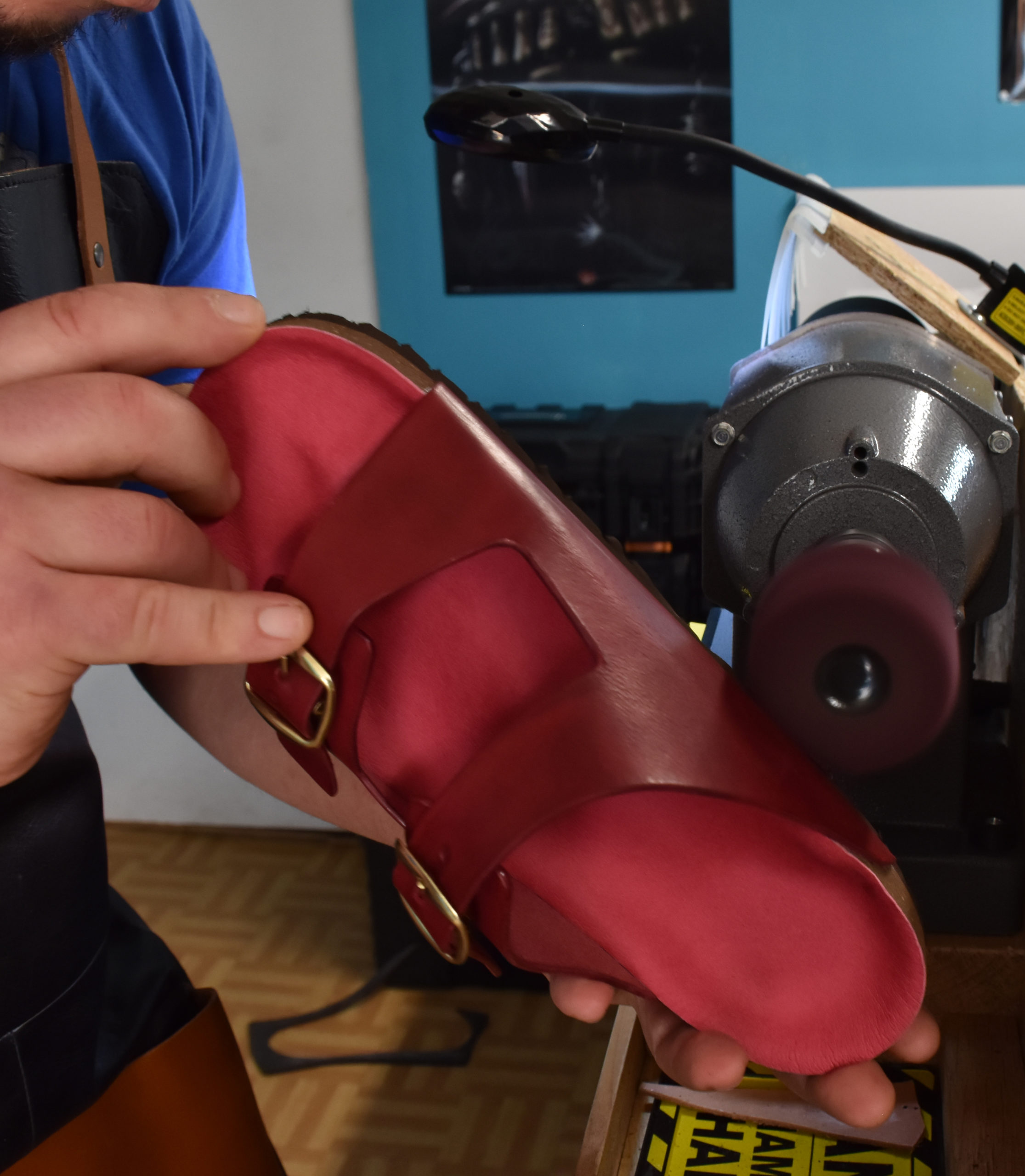 Le cordonnier réalise ensuite le rainurage des plis (il retire la couche supérieure du cuir grâce à une rainette) afin que le plis soit franc et statique pour le montage de la sandale. Il réalise ensuite un pressage pour former le plis.