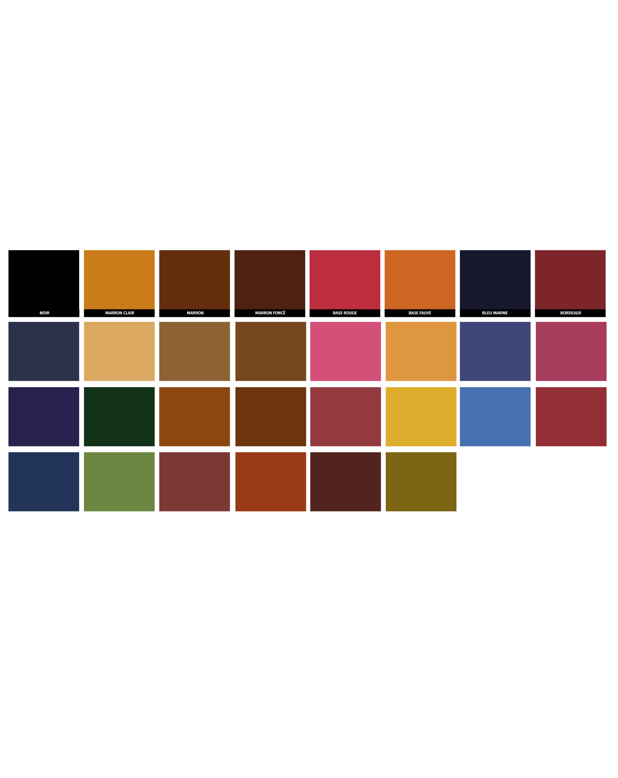 La teinture du cuir est ensuite réalisée selon le choix du patient. Le nuancier propose un large choix de teintes disponibles pour satisfaire au mieux leurs attentes. Les teintes sont ensuite reproduites sur mesure par le cordonnier avec une teinture française naturelle (à base aqueuse).